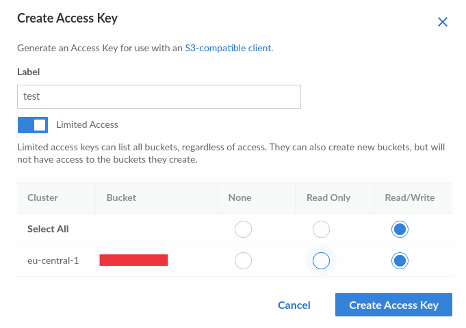 the menu, select your newly created bucket and give it the desired permissions. This will give you your access key